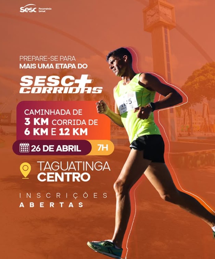 As inscrições estão na reta final para a etapa de Taguatinga do Sesc+Corridas, promovida pelo Serviço Social do Comércio do Distrito Federal (Sesc-DF). A corrida será realizada no próximo dia 26 de abril, com largada prevista para as 7h, em Taguatinga Centro, nas proximidades do viaduto, no Setor C Norte.